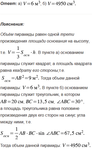Найдите объём пирамиды с высотой , если: а) = 2 м, а основанием является квадрат со стороной 3 м; б) = 2,2 м, а основанием является треугольник АВС, в котором АВ = 20 см, ВС = 13,5 см, АВС = 300.