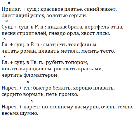 Красивое платье, синий жакет, пиджак брата, портфель отца, смотреть телефильм, читать роман, рубить топором, писать карандашом, быстро бежать, хорошо плавать, плавить металл, песня строителей, по-осеннему пасмурно, блестящий успех, рисовать красками, гнездо орла, сердито ворчать, очень темно.