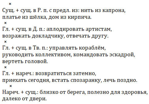 Аплодировать артистом, возражать докладчику, управлять кораблём, руководить коллективом, возвратиться затемно, приехать сегодня, близко от берега, командовать эскадрой, встать спозаранку, полезно для здоровья, нить из капрона, платье из шёлка.