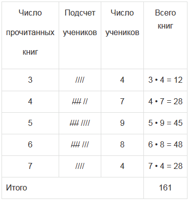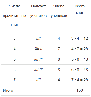 Получив список, в котором числа повторялись, он решил представить результаты опроса в виде таблицы. В первый столбец он вписал количество прочитанных учеником книг и при подсчете использовал следующие обозначения: / - 1 ученик, / / / / - 5 учеников.Запишите таблицу и ответьте на вопросы: