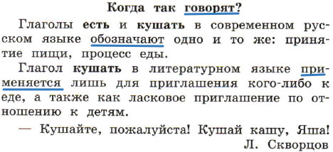 Глагол кушать в литературном языке применяется лишь для приглашения кого-либо к еде, а также как ласковое приглашение по отношению к детям.
