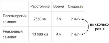 Пассажирский самолет пролетел 2550 км за 3 ч полета, а реактивный самолет - 13 600 км за 4 ч. Во сколько раз скорость реактивного самолета больше скорости пассажирского?