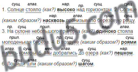 1. Солнце стояло высоко над горизонтом. 2. Солнце насквозь пронизывало берёзовую рощу. 3. На склоне небольшого пригорка одиноко стояла молоденькая берёза. 4. В воздухе роями вились комары. 5. Мы добрались до озера пешком. 6. Лошади шли шагом.